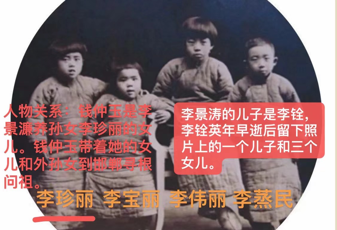 2025年6月18日下午,清代末年李景濂进士抚养大的养孙女之一李珍丽之女钱仲玉(全国政协原副主席钱正英的侄女),携女儿和外孙女祖孙三代,在李景濂曾孙、新华社原常驻联合国记者李健雄和夫人张红陪同下,到广府武家大院养外祖母武毓莞故居和邯郸道李景濂故居寻根祭祖。(李景濂收养了三弟李景涛的儿子李铨的一个儿子和三个女儿,钱仲玉是李铨的二女儿李珍丽的女儿)