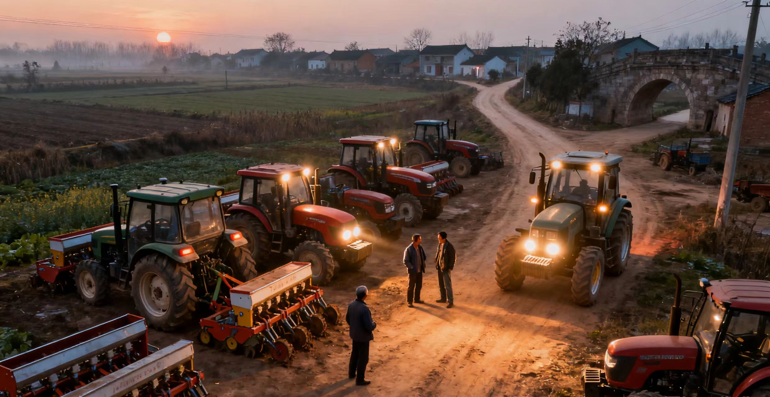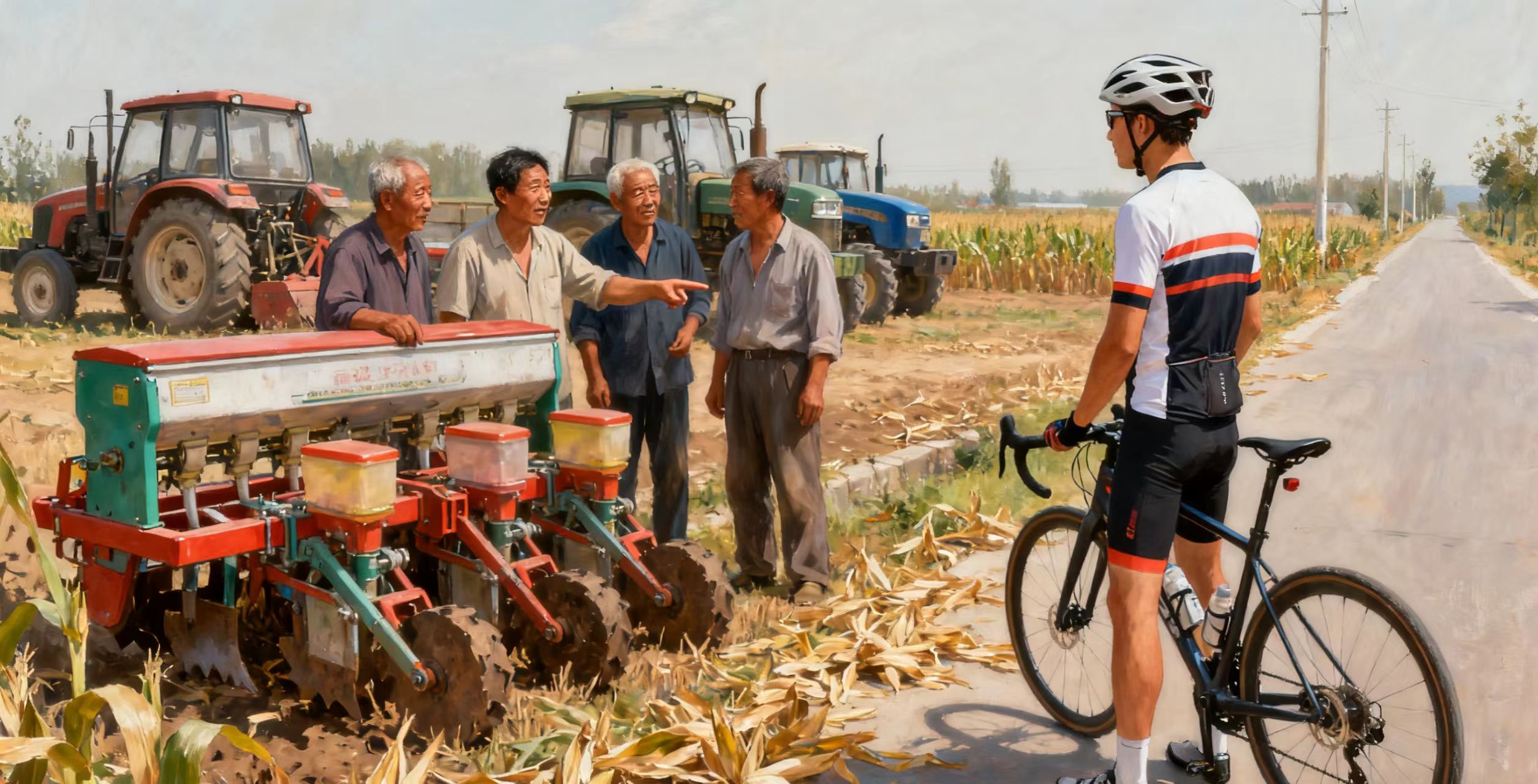 刚过石桥村,便听到一阵机器轰鸣声,几台大型拖拉机亮着醒目的大灯,在晨光与雾气里格外显眼,暖黄的灯光穿透薄雾,照亮了旁边待耕的田地。起初我还好奇,是在赶建什么工程吗?凑近了才看清,拖拉机都挂装着旋耕播种机,正整装待发。我向同行的骑友和路边的老乡打听,才知道眼下已有农户收完了玉米,这些机器是要把玉米秸秆旋进地里,为10月初播种小麦做准备——原来,初秋的田野里,早已在雾与晨光的映衬下,悄悄奏响了秋收秋耕的序曲。